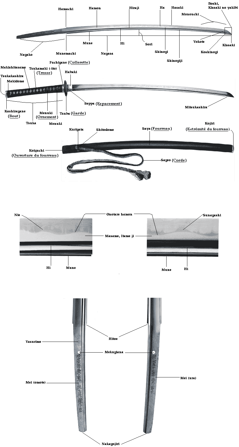 • Kissaki: a ponta; sua forma determina a capacidade de estocada e a geometria do acabamento (bōshi e fukura).